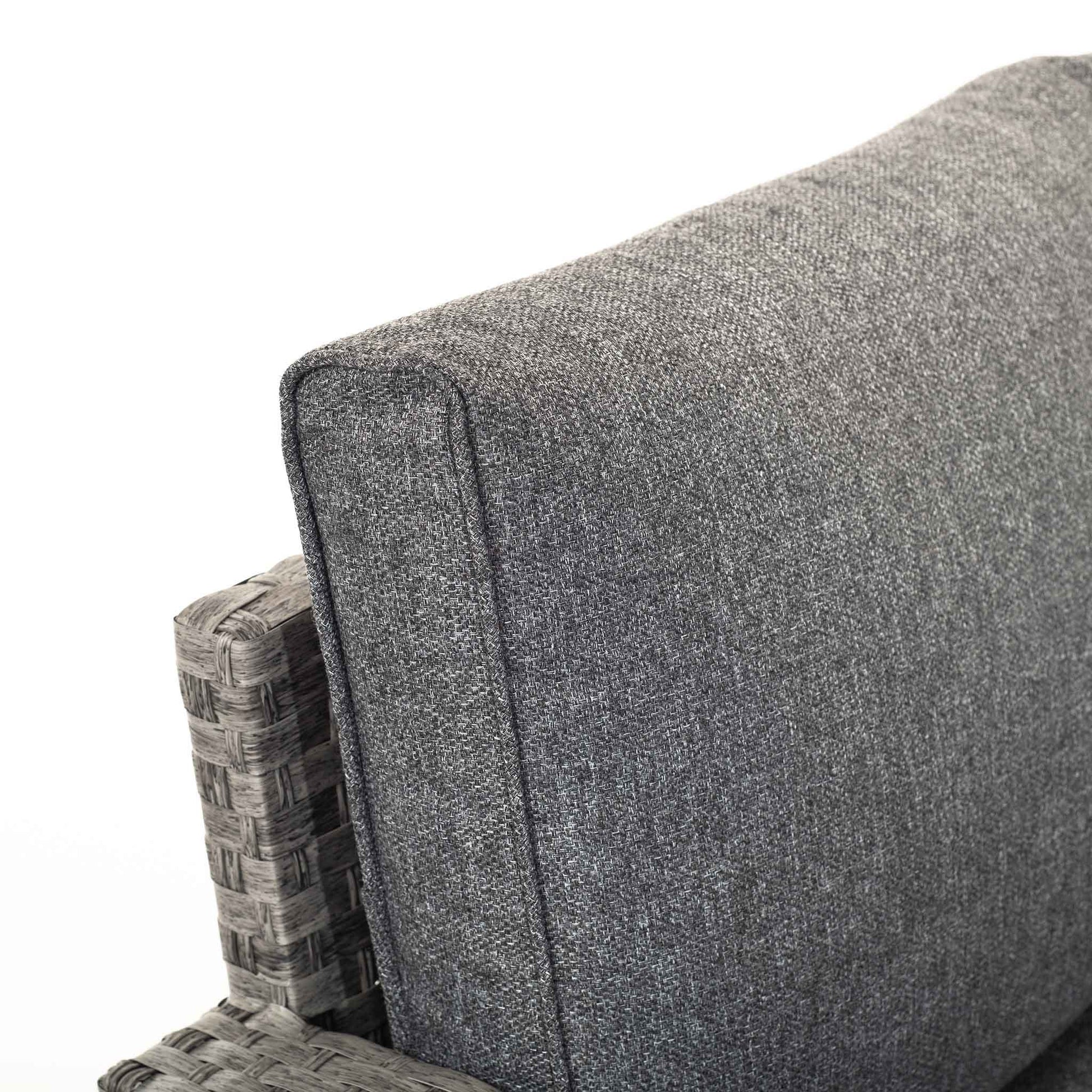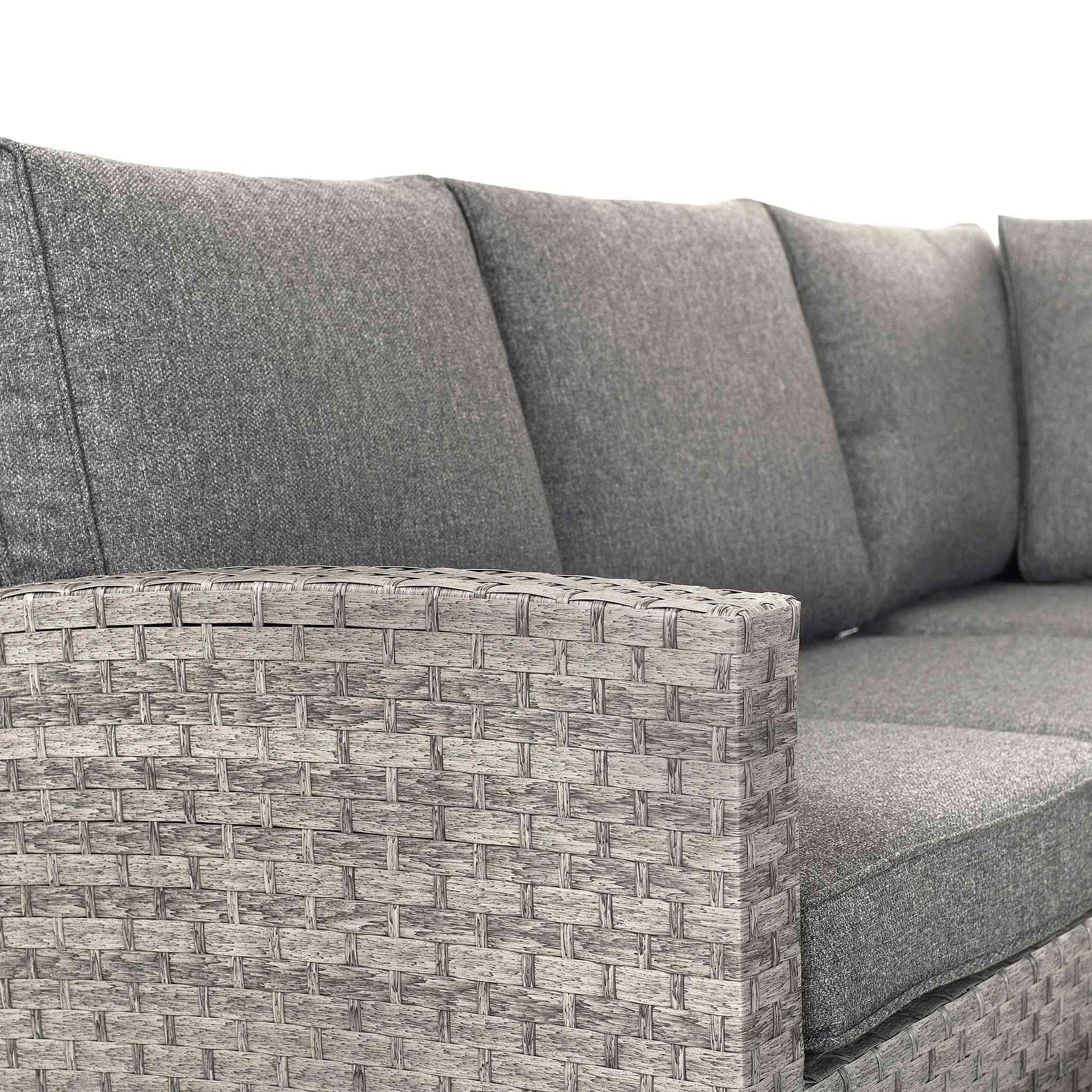 The Melody garden rattan corner sofa set comes in a chic grey hue and offers a blend of comfort and style, enhanced by soft charcoal-coloured cushions that invite relaxation.