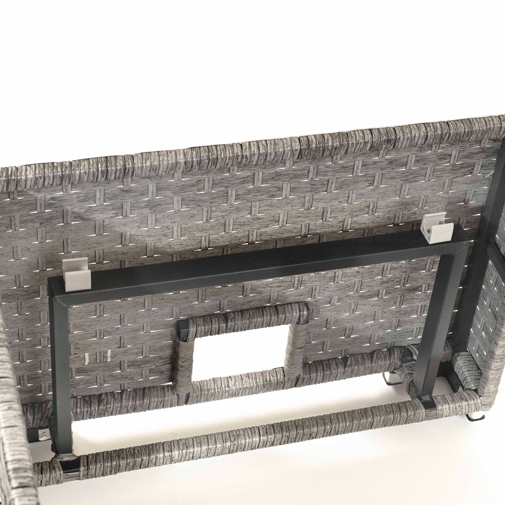 Complemented by three matching stools, this multi-coloured grey rattan set boasts a wide weave texture that adds depth and sophistication to any outdoor space.